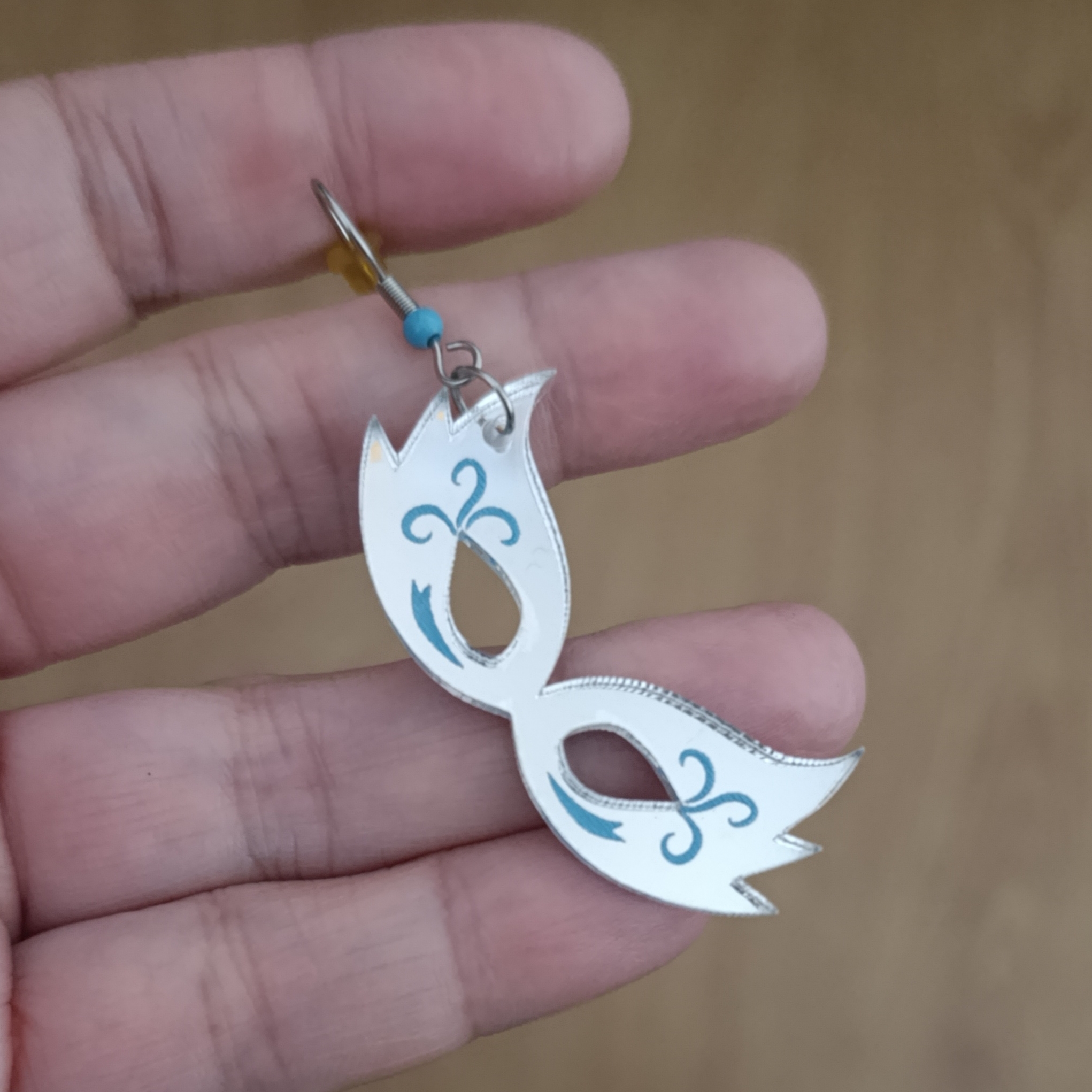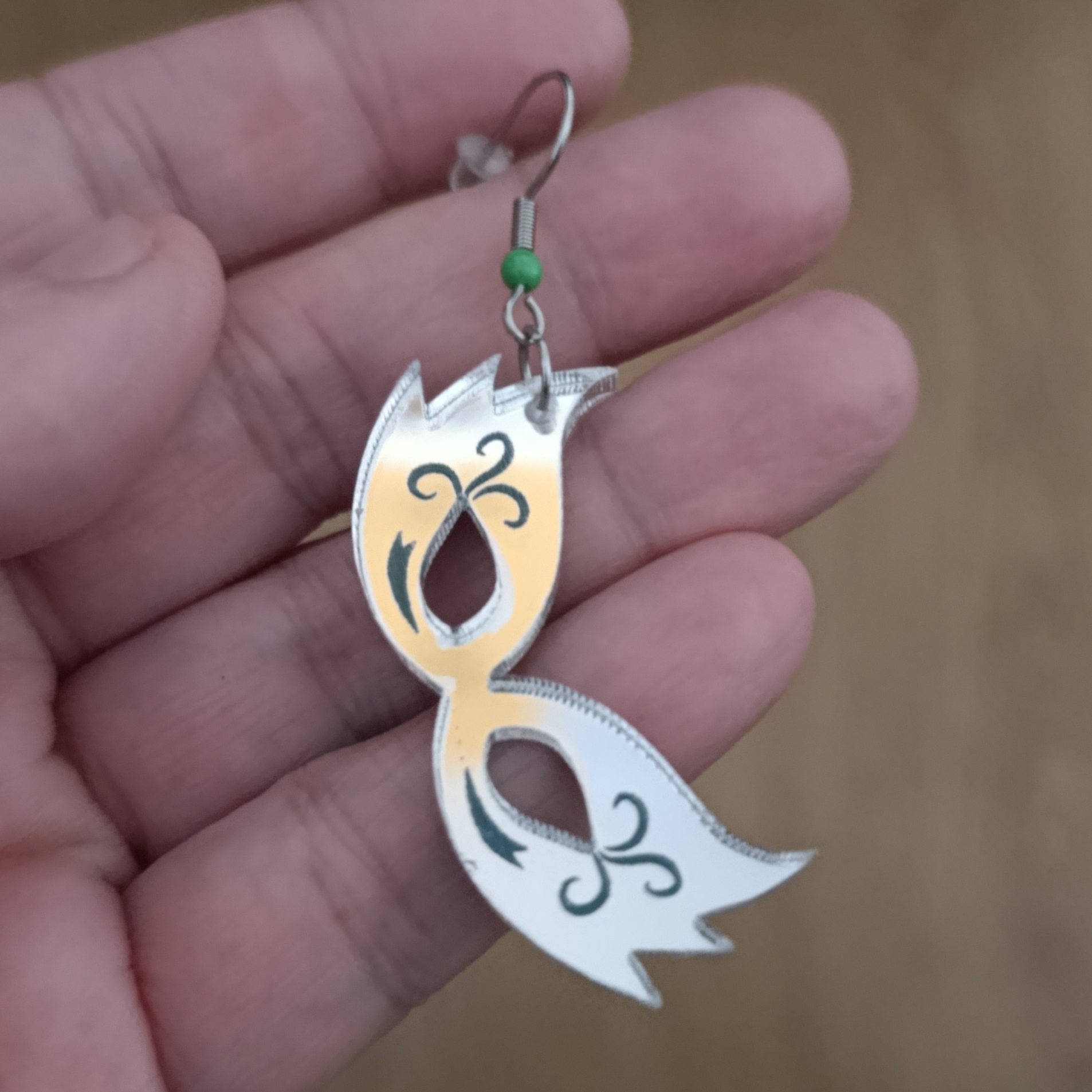 Antifaz de metacrilato efecto espejo con detalles grabados montados en ganchos hippies de acero.