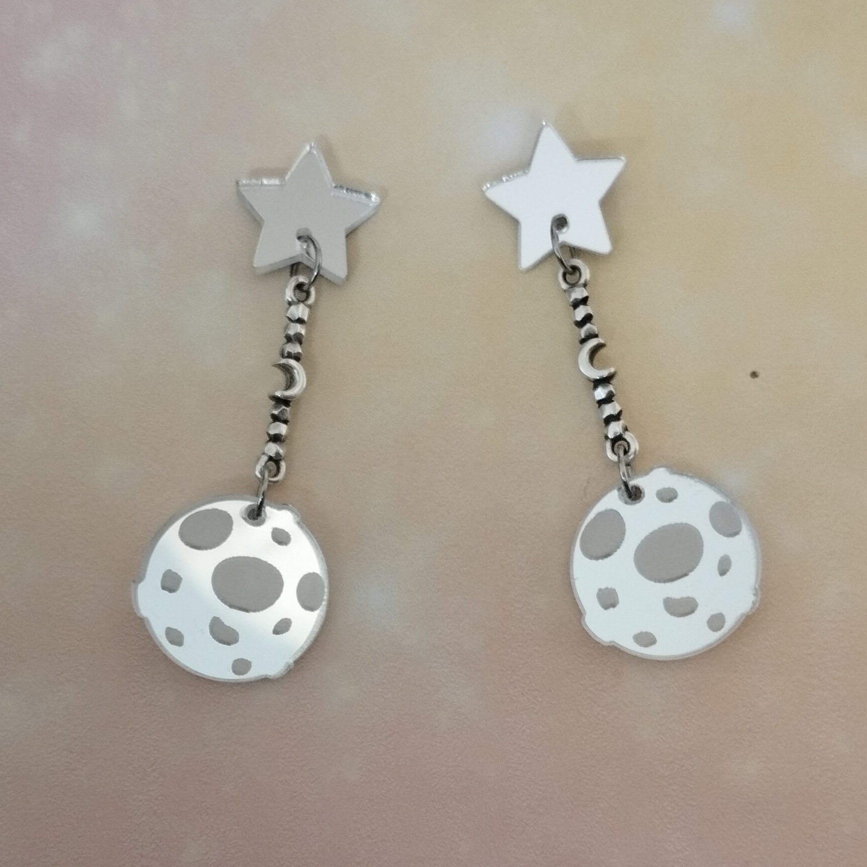 Luna llena de metacrilato efecto espejo con barrita de acero con media luna y estrella de metacrilato efecto espejo con cierre de acero de presión.